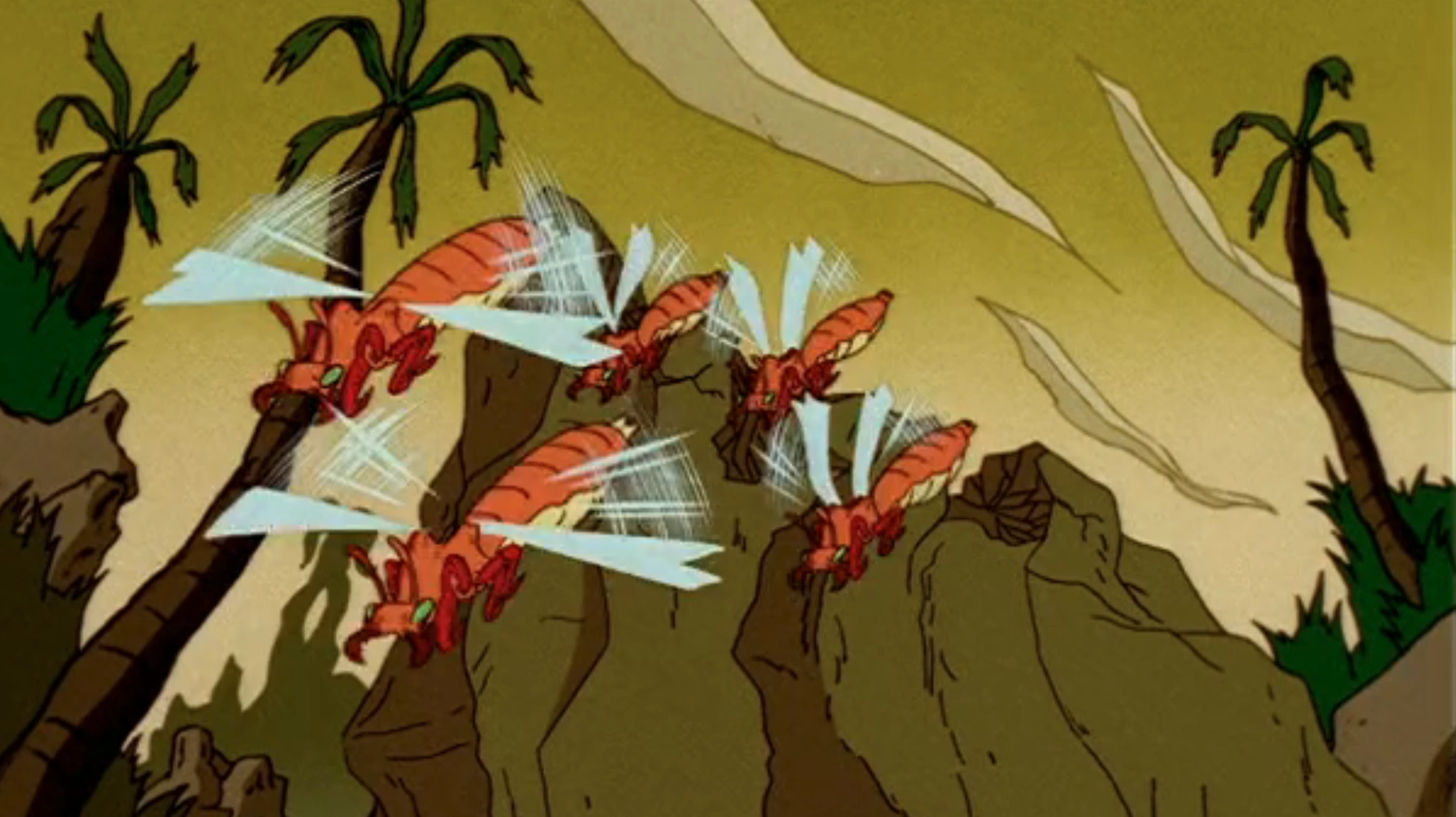 Fireflies are like dragonflies but they can stream-shoot fire from their bottoms. They chased & attacked Alan with a rare albino gazelle calf out of a cave, while they were chasing Peter & Judy with Alan & the gazelle streaming fire at them they, then they jumped into the river with the fireflies right behind them, then they used horsetail rushes as spit wads against the fireflies when Peter, Alan & Judy shot water at the fireflies the 1st time their fire went, but for the 2nd time their fire went out they retreated.